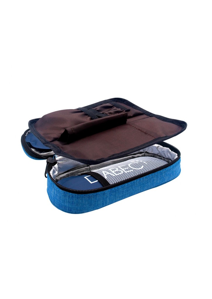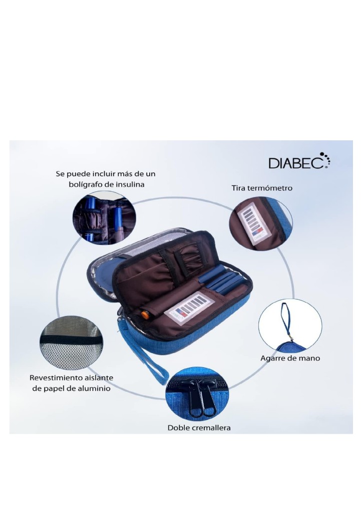 Bolso de viaje para insulina (transporte de medicamentos), Ideal para la conservación de productos que necesitan refrigerarse en frío. Estabilidad de la temperatura entre los 2ºC y 8ºC durante horas. Dispone de múltiples compartimentos. Incluye dos bolsas de gel de 95 ml c/u. Medidas: 20x9,5x4,5cm - peso:330gr.